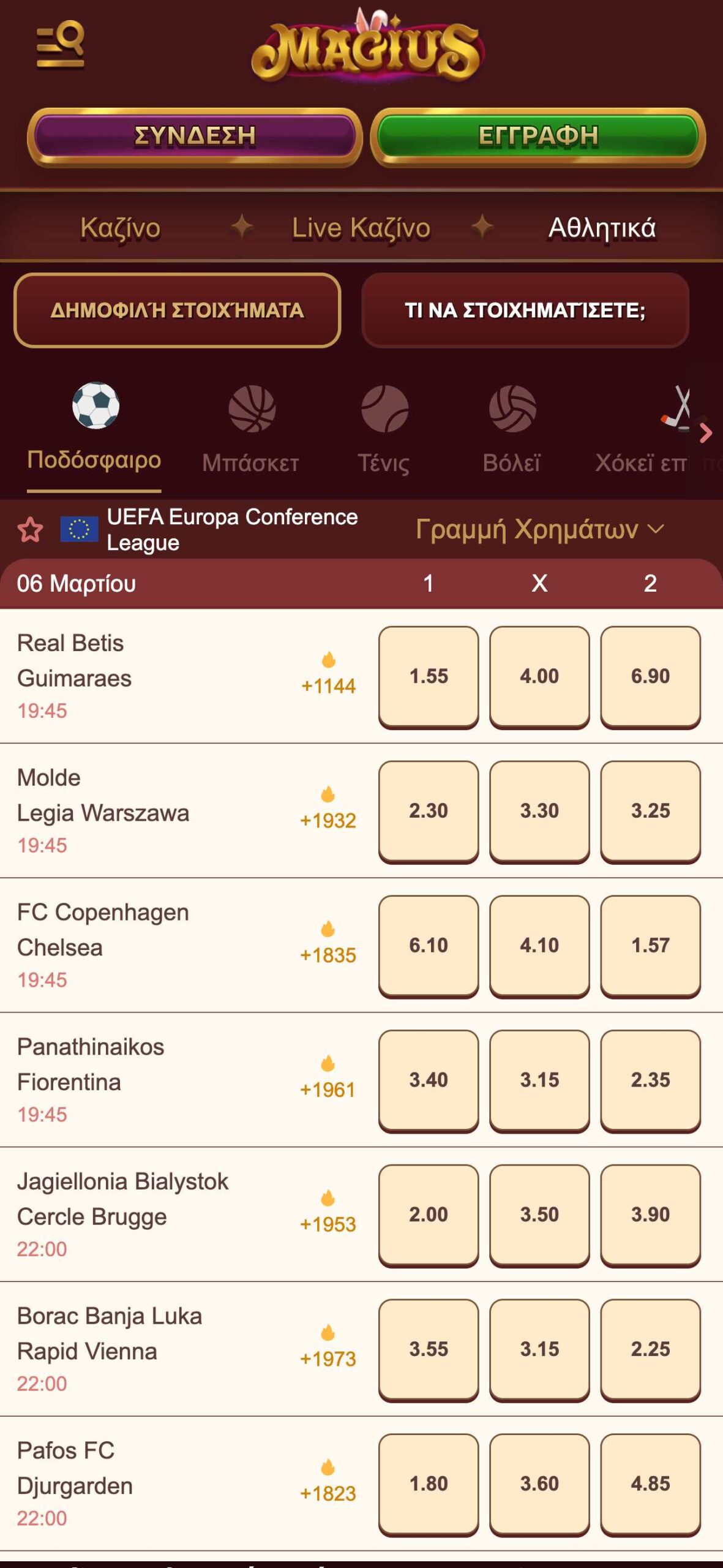 Οι επιλογές που έχετε στη στοιχηματική Magius είναι 26 διαφορετικά σπορ, virtuals και στοίχημα σε μη-αθλητικά γεγονότα όπως ψυχαγωγία, βραβεία, πολιτική κλπ. Ας δούμε όμως το βασικό κομμάτι που αφορά στα αθλήματα.