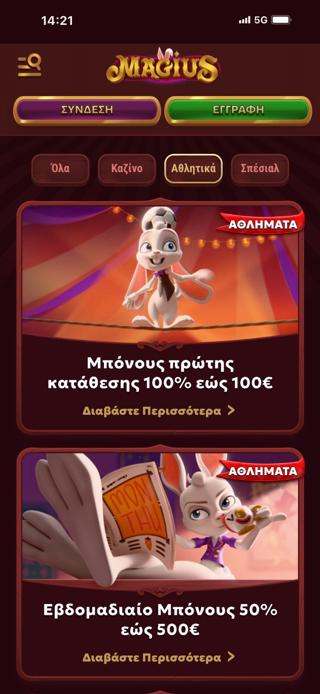 Στη στοιχηματική Magius θα νιώσετε πως βρίσκεστε σε ένα θέατρο που προσφέρει θέαμα με μάγους και ταχυδακτυλουργικά! Με “μασκότ” ένα κουνέλι (ή λαγό!!) και γραφικά που θυμίζουν μαγικά κόλπα, η πλατφόρμα φαίνεται πως έχει έντονη τη διάθεση να διασκεδάσει και να χαλαρώσει τους χρήστες.