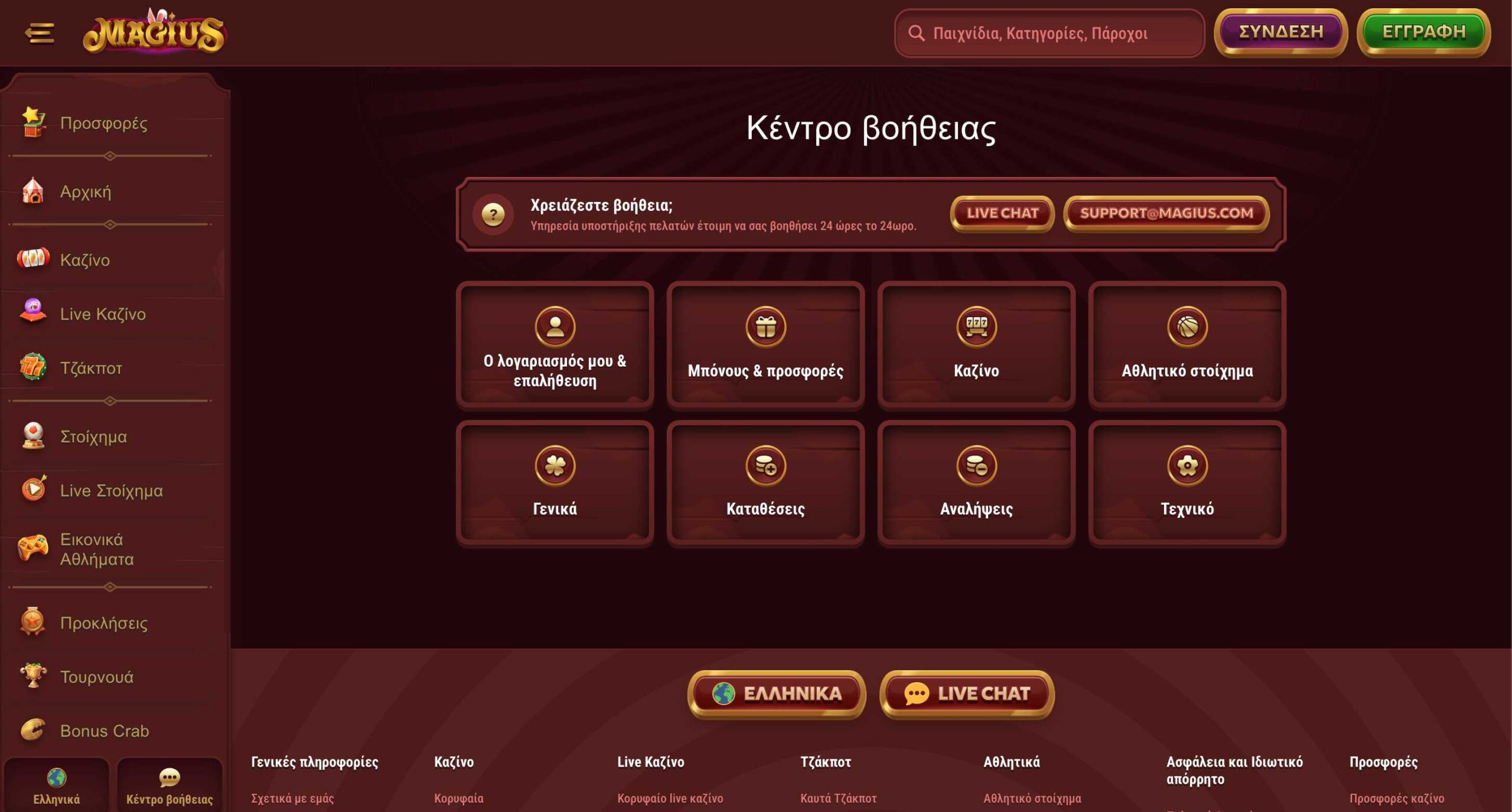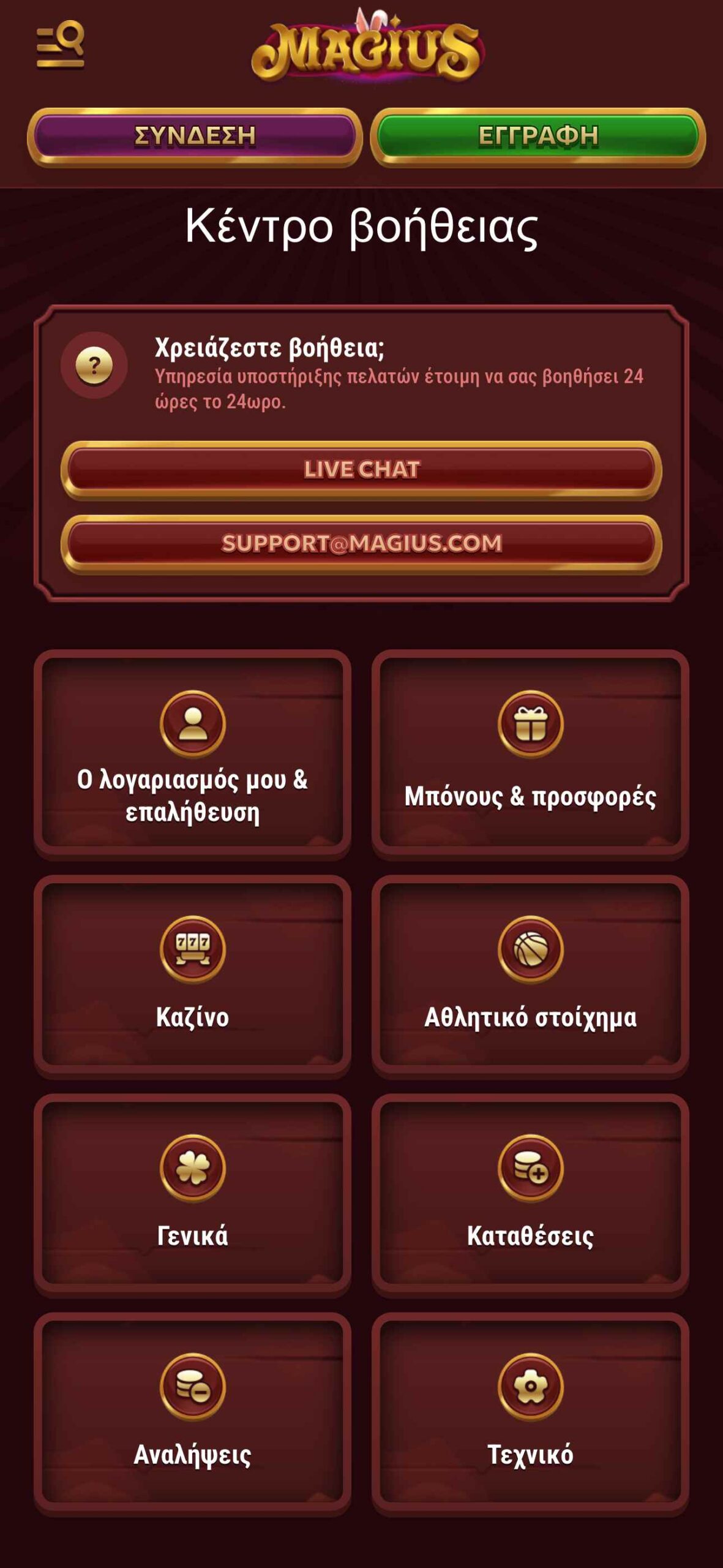 Εναλλακτικά, αν θέλετε να έρθετε σε επικοινωνία με τη στοιχηματική μπορείτε να πατήσετε το κουμπί του Live Chat και να συνομιλήσετε με έναν διαθέσιμο εκπρόσωπο ζωντανά, όχι όμως στην ελληνική γλώσσα, αλλά μέσα από την υπηρεσία αυτόματης μετάφρασης. Αν ψάχνετε για κάτι πιο εξειδικευμένο και δε μπορείτε να το λύσετε μέσω της ζωντανής συνομιλίας, μπορείτε να στείλετε μήνυμα στο Customer service της πλατφόρμας, στο email support@magius.com