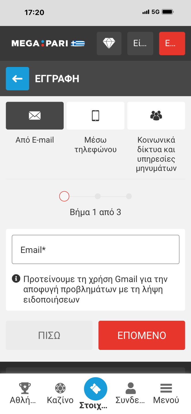 H πλατφόρμα της Megapari προσφέρει τρις διαφορετικούς τρόπους εγγραφής: με τηλέφωνο, με κοινωνικά δίκτυα και υπηρεσίες μηνυμάτων και με email. Σας παρουσιάζουμε την εγγραφή μέσω email, που είναι και η πληρέστερη από τις τρεις.