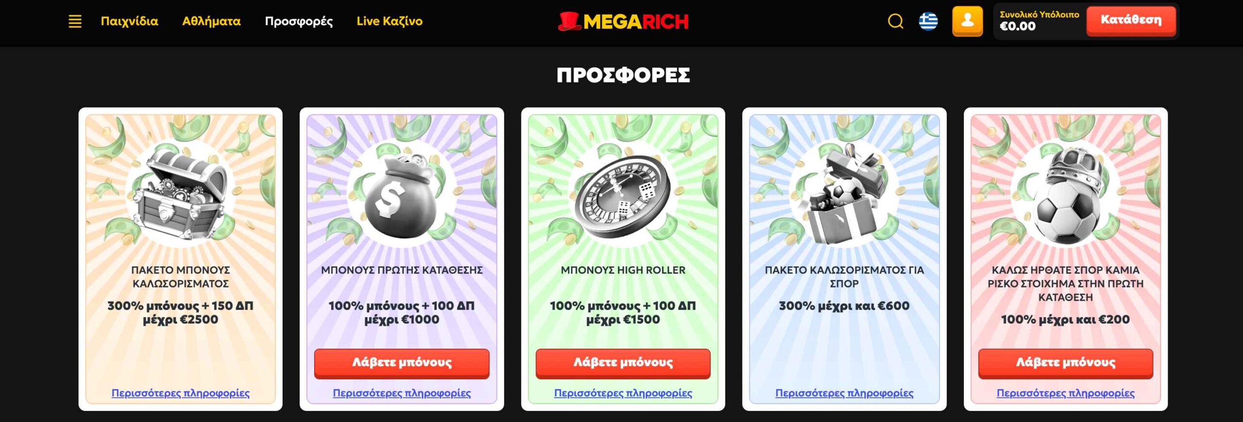 Όπως συνηθίζεται η καλύτερη προσφορά είναι αυτή του καλωσορίσματος και γίνεται άμεσα διαθέσιμη με το που ολοκληρώσετε την εγγραφή σας. Συγκεκριμένα, η Megarich θα «ματσάρει» τις 3 πρώτες καταθέσεις σας έως και 200€. Σε αντίθεση όμως με το μεγαλύτερο μέρος του ανταγωνισμού τα μπόνους ποσά πρέπει να τζιραριστούν μόλις 6x φορές πριν μπορέσετε να αναλήψετε τυχόν κέρδη που προκύψουν από αυτά. Δηλαδή, αθροιστικά μπορείτε να λάβετε έως και 600€ σε μπόνους.
