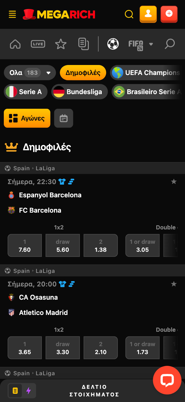 Το live betting στην Megarich αποτελεί μία τελείως διαφορετική, με την καλή έννοια, εμπειρία. Χάρη στις πολλές κατηγορίες και πληθώρα eSports επιλογών, η σελίδα με τα live παιχνίδια δεν είναι ποτέ αδειανή. Συγκεκριμένα, το περιβάλλον της πλατφόρμας είναι ξεκάθαρο και λειτουργικό με όλες τις επιλογές τόσο στα live όσο και στα μελλοντικά παιχνίδια να είναι χωρισμένες ανά κατηγορία ώστε να βρίσκετε εύκολα αυτό που ψάχνετε.