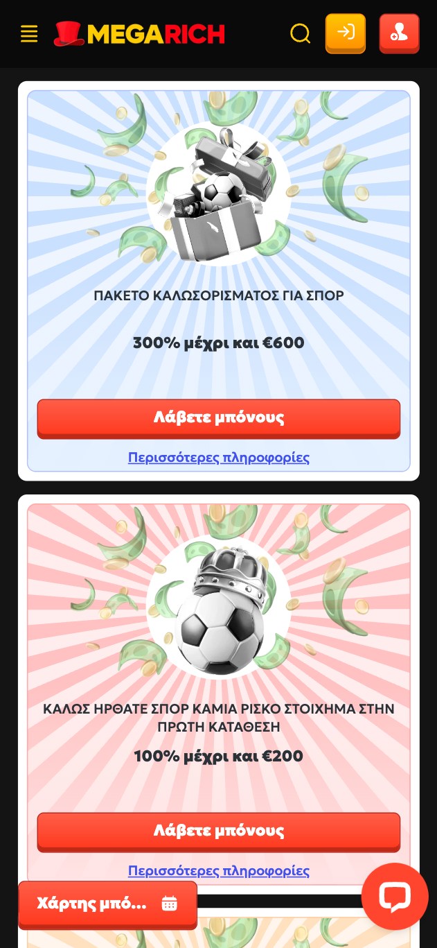 Όπως και στις υπόλοιπες πλατφόρμες της εταιρείας, έτσι και στη Megarich θα βρείτε μια μεγάλη ποικιλία από προσφορές και διάφορες προωθητικές ενέργειες. Επειδή η αξιολόγηση αναφέρεται στο sportsbook της Megarich θα αναφερθούμε σε όσες αφορούν ή περιλαμβάνουν τον εν λόγω τομέα.