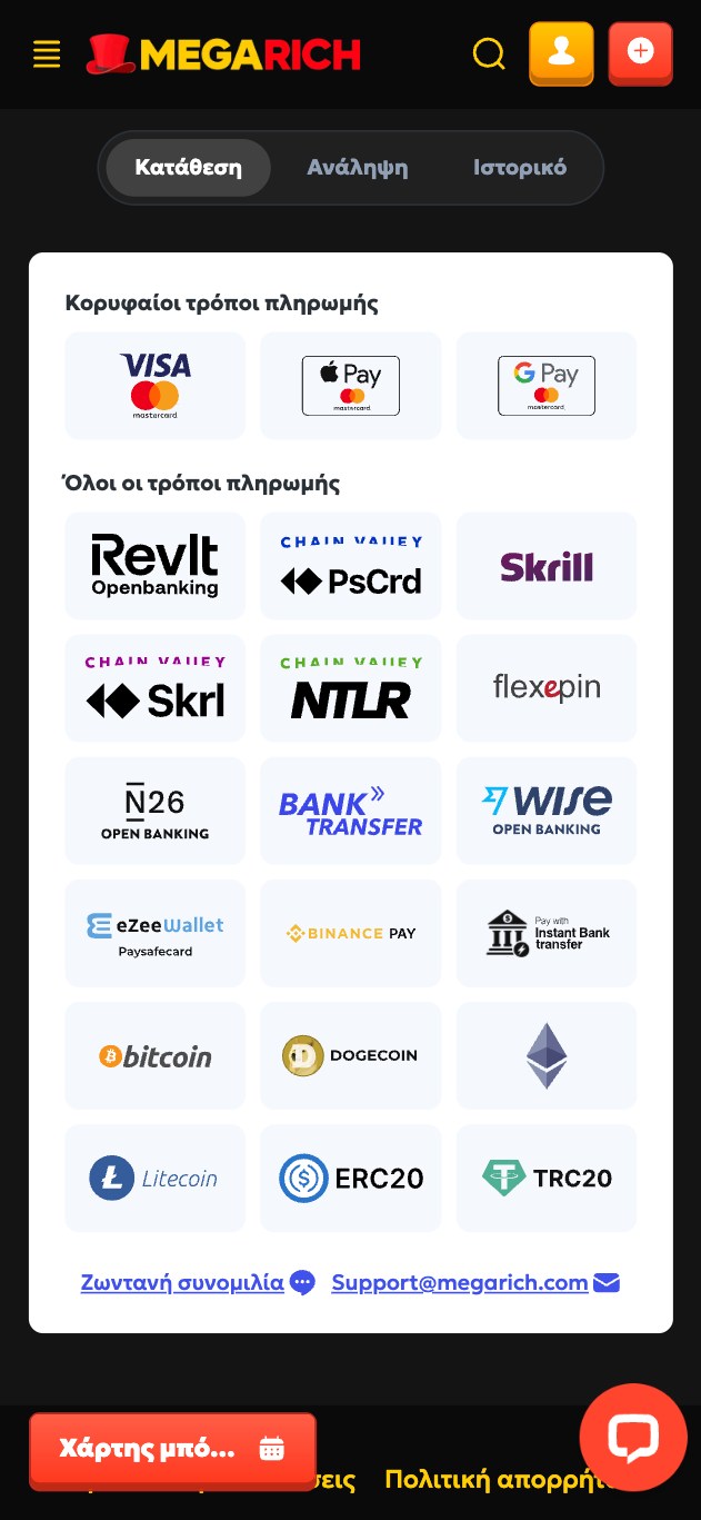 Από τραπεζική μεταφορά και κάρτες έως και διαδικτυακές υπηρεσίες μέχρι και κρυπτονομίσματα, η Megarich προσφέρει μία από τις μεγαλύτερες ποικιλίες στις μεθόδους συναλλαγών. Πιο συγκεκριμένα οι διαθέσιμες επιλογές είναι Mastercard, Visa, Apple Pay, Google Pay, MiFinity, Bitcoin, Litecoin, Ethereum, Doge, Binance Pay, ERC20/TRC20, Tron και διάφορων άλλων τραπεζικών συστημάτων όπως η Revolut και η Wise. Κάτω θα βρείτε αναλυτικό πίνακα με όλες τις απαραίτητες πληροφορίες που αφορούν νέους χρήστες. Περαιτέρω πληροφορίες, μέθοδοι και ενημερωμένα όρια συναλλαγών γίνονται διαθέσιμα όσο ανεβαίνετε επίπεδο VIP.