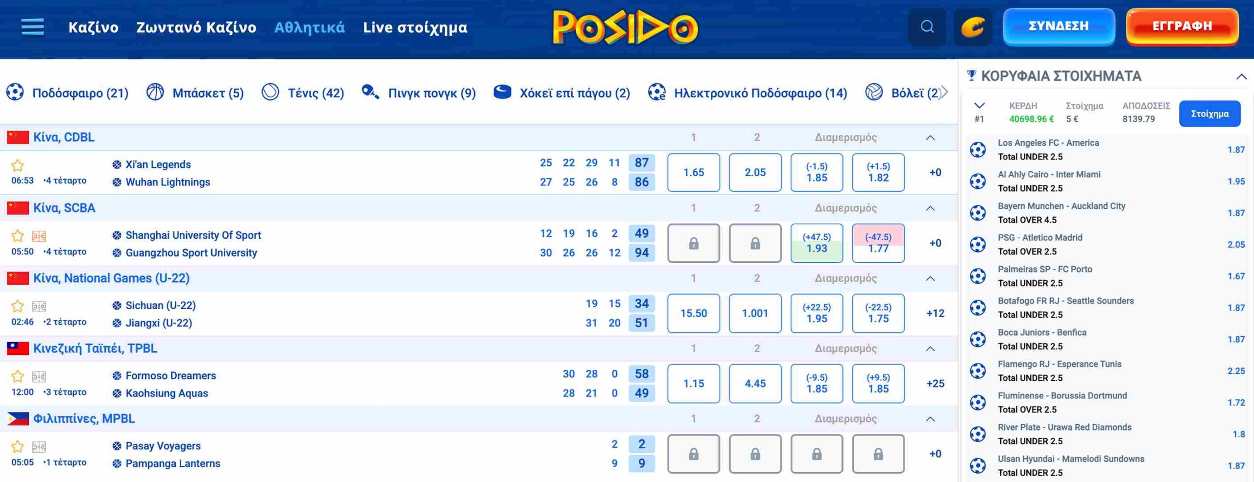 Η δομή του sportsbook της Posido είναι ομολογουμένως αρκετά περίεργη χωρίς όμως να απουσιάζει η ευχρηστία. Πατώντας στην κατηγορία «Αθλητικά» θα εμφανιστούν όλοι οι κορυφαίοι αγώνες των επόμενων ωρών και ημερών ενώ στα αριστερά θα βρείτε την λίστα με τα αθλήματα. Μάλιστα, δίπλα στο καθένα υπάρχει μέσα σε παρένθεση το πλήθος των αγώνων που θα βρείτε εκεί. Συγκεκριμένα θα βρείτε: