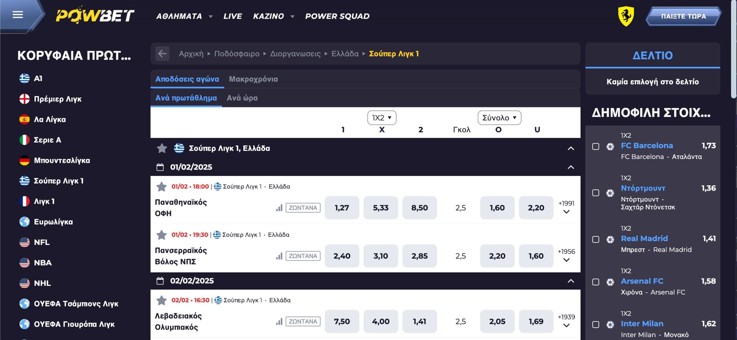 Στο live betting της Powbet η λίστα με τα διαθέσιμα σπορ δεν είναι τόσο μεγάλη όσο στo pre-game. Μπορείτε να στοιχηματίσετε στα κυρίαρχα ανά τον κόσμο αθλήματα, όπως ποδόσφαιρο, μπάσκετ, τένις, βόλεϊ και χόκεϊ επί πάγου, μπορείτε όμως και να βρείτε ενδιαφέρουσες αγορές και σε άλλα αθλήματα, όπως πινγκ πονγκ, κρίκετ, μπιτς βόλεϊ, μπιλιάρδο, φούτσαλ, μπέιζμπολ, χάντμπολ και εννοείται όλα τα eSports.