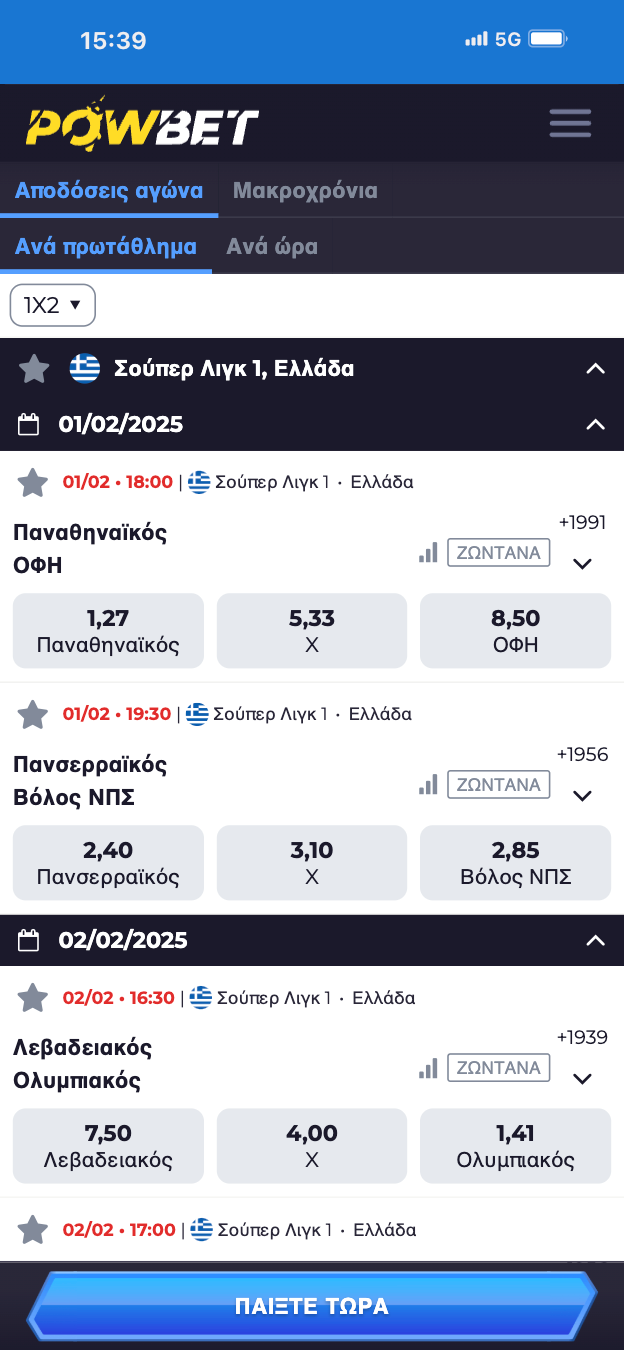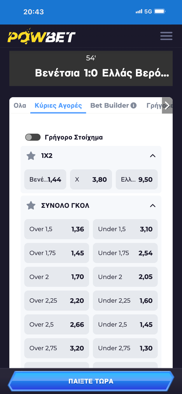 Σίγουρα, όπως και τα διαθέσιμα σπορ, οι αγορές δεν είναι αμέτρητες όπως στο pre-game, όμως είναι αρκετές για να ικανοποιήσουν τον μέσο παίκτη. Αυτό που ξεχωρίζει στο live betting της Powbet είναι οι γρήγορες αγορές και το live streaming, το οποίο όμως θα πρέπει να πούμε πως δεν διατίθεται για όλους τους αγώνες, αλλά για επιλεγμένες αναμετρήσεις σε ορισμένα αθλήματα.