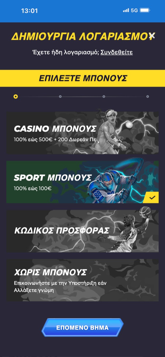 Ανοίγοντας έναν νέο λογαριασμό στην πλατφόρμα, θα βρείτε να σας περιμένει (φυσικά αν θέλετε να το διεκδικήσετε) ένα δυνατό μπόνους καλωσορίσματος, 100% του ύψους της πρώτης σας κατάθεσης έως 100 ευρώ.