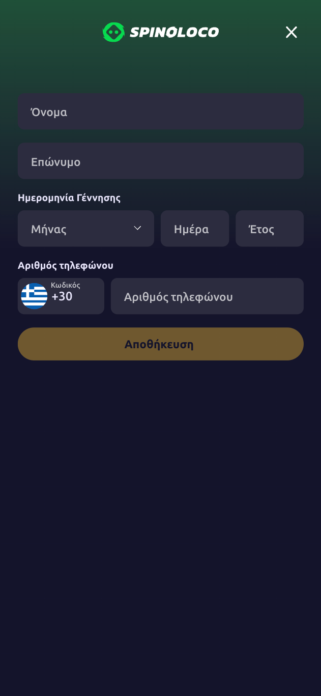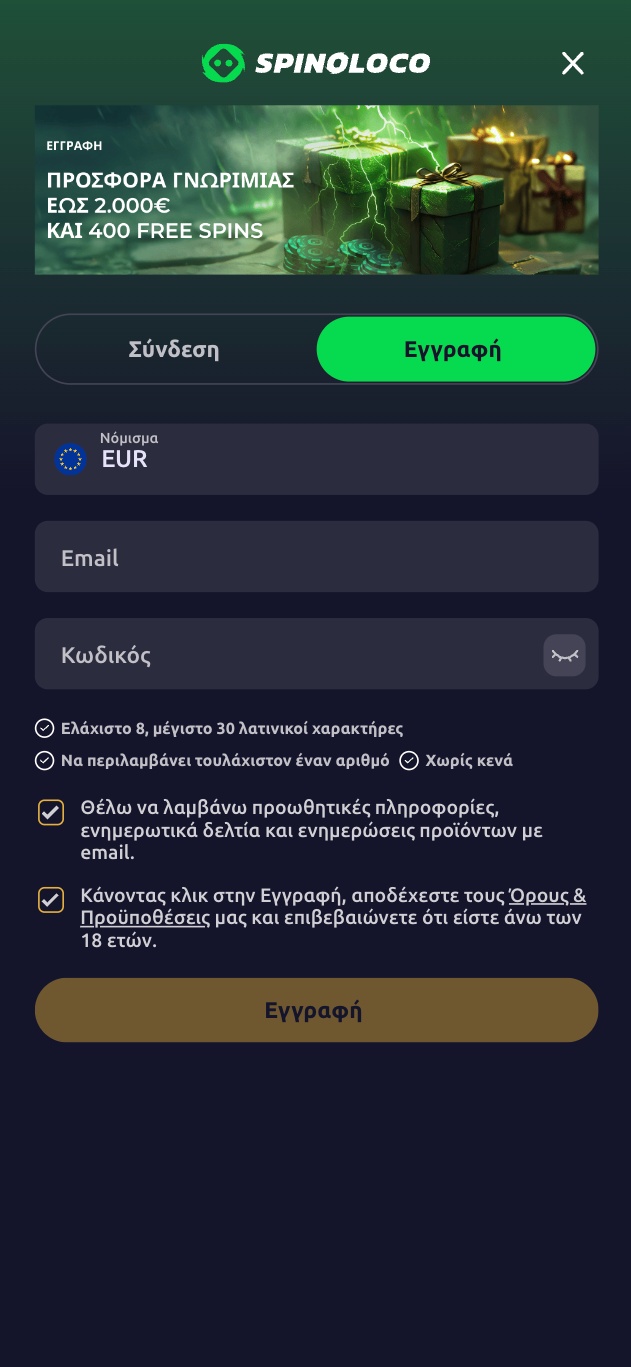 Για να εγγραφείτε στη στοιχηματική Spinoloco το μόνο που έχετε να κάνετε είναι να πατήσετε το αντίστοιχο κουμπί πάνω δεξιά στην οθόνη σας και να ακολουθήσετε τα βήματα, μέχρι να ολοκληρωθεί η διαδικασία. Αρχικά, συμπληρώνετε το email σας και έναν κωδικό πρόσβασης, στη συνέχεια εισάγετε τα στοιχεία σας και το τηλέφωνό σας και μετά ανοίγει το παράθυρο για να κάνετε κατάθεση στο λογαριασμό σας.