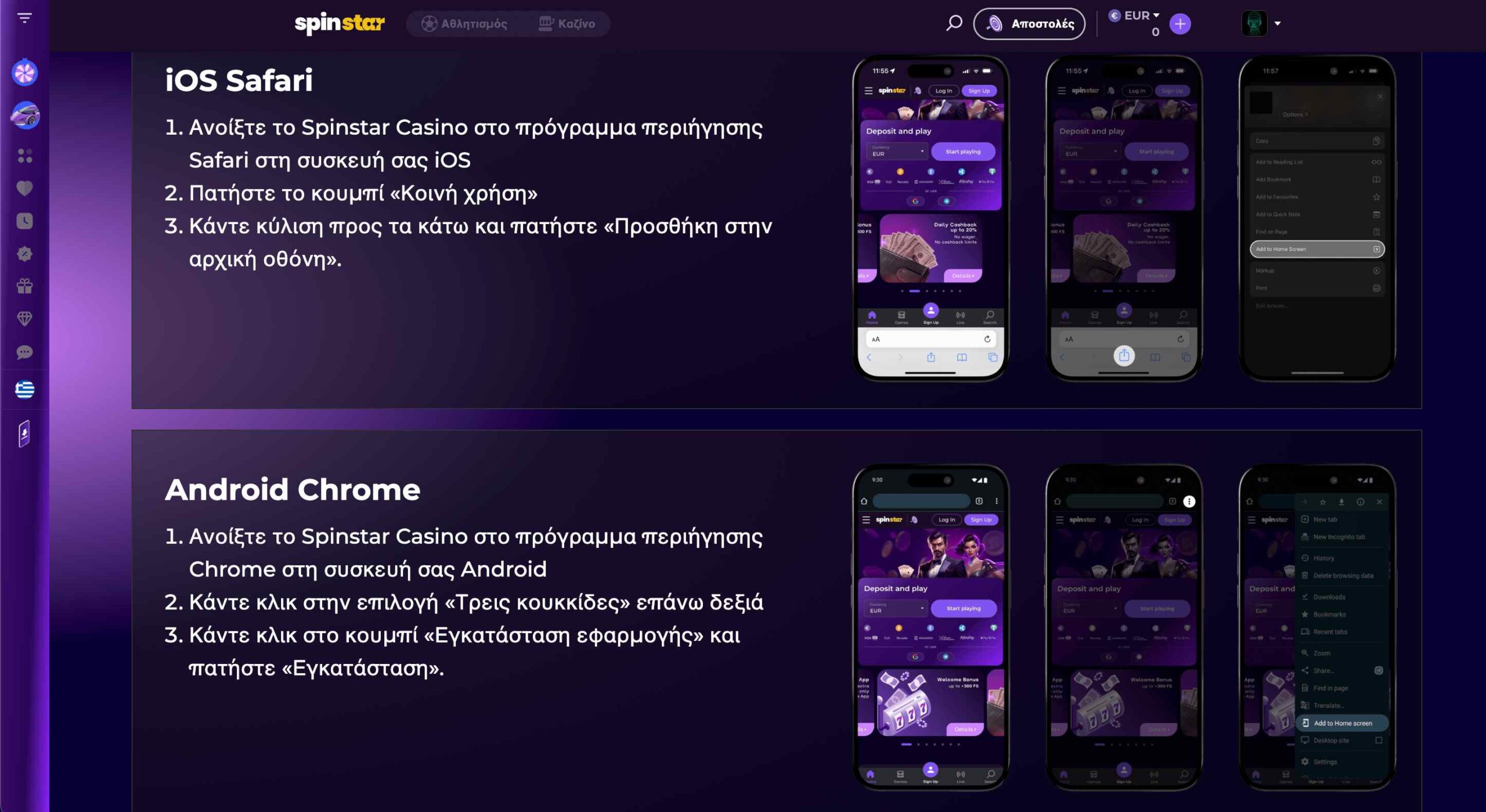 Ας αρχίσουμε με τα app που είναι και ειδικά σχεδιασμένα για τις Android αλλά και τις iOS συσκευές. Το mobile betting γίνεται εύκολο, γρήγορο, χωρίς καθυστερήσεις και χωρίς να χρειάζεται να μπαίνετε κάθε φορά στον ιστότοπο μέσα από τον browser σας. Αυτό σημαίνει και μεγαλύτερη ασφάλεια, ευκολία αλλά και δυνατότητα να μπείτε στην εφαρμογή και να κάνετε ό,τι θέλετε (εκτός του να στοιχηματίσετε) ακόμη και χωρίς να είστε συνδεδεμένοι στο διαδίκτυο! Γενικά η εμπειρία του στοιχήματος από το κινητό, όταν μιλάμε για εφαρμογή είναι η βέλτιστη δυνατή! Και το καλύτερο είναι πως η Spinstar προσφέρει και έξτρα μπόνους αλλά και αποκλειστικά προνόμια σε όσους κατεβάσουν και ποντάρουν μέσα από την εφαρμογή.