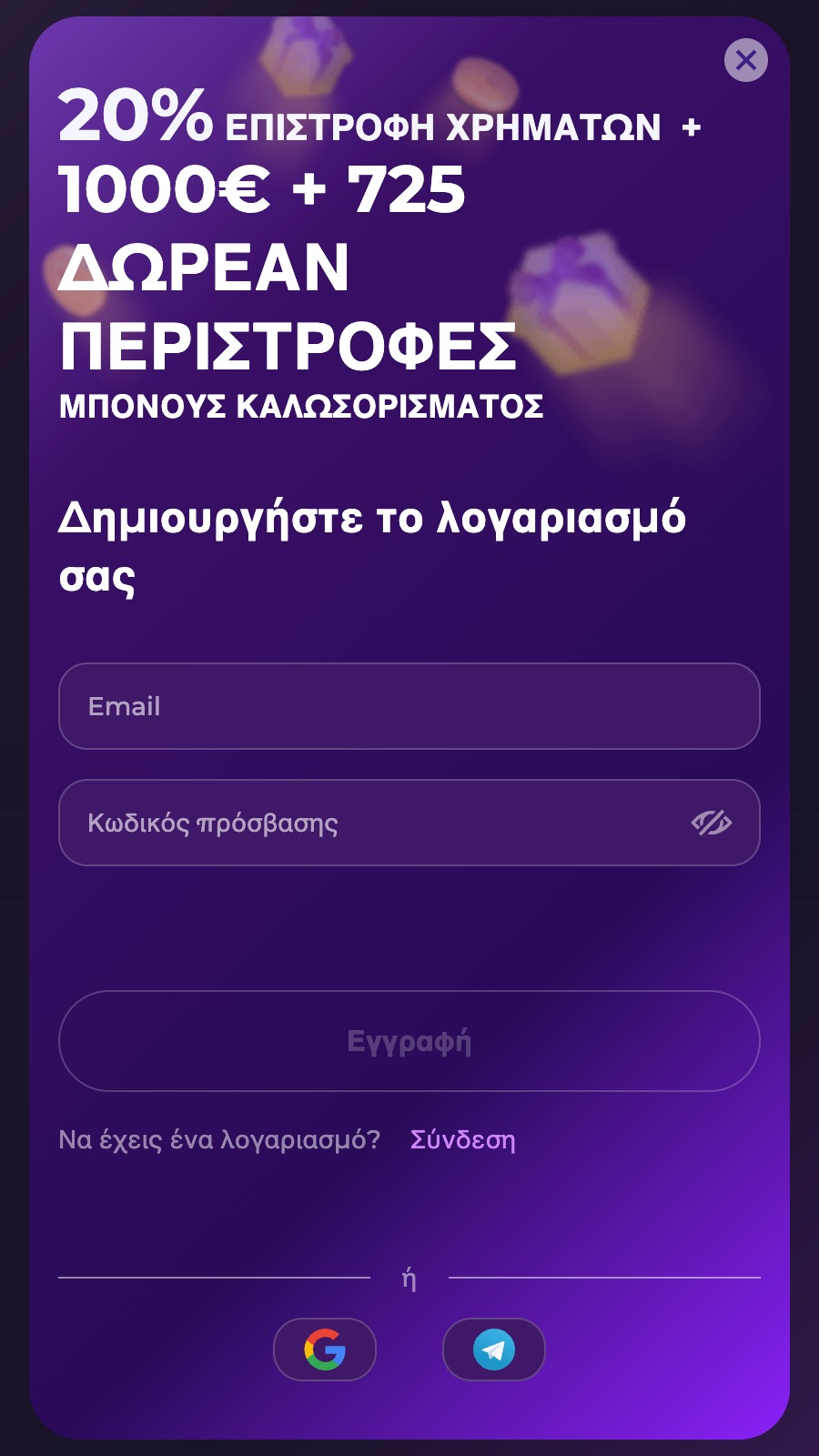 Αν αναρωτιέστε πως θα παίξετε στοίχημα στη Spinstar.bet, τότε το μόνο που έχετε να κάνετε είναι να εγγραφείτε και να καταθέσετε χρήματα στο λογαριασμό που θα ανοίξετε. Η εγγραφή γίνεται σε ένα μόνο βήμα! Ουσιαστικά, απλώς πατάτε το κουμπί που λέει “Εγγραφή” στο πάνω δεξιά μέρος της σελίδας και σας ανοίγει ένα παράθυρο, που σας ζητάει να συμπληρώσετε το email σας και να δημιουργήσετε έναν κωδικό πρόσβασης για την είσοδο σας στην πλατφόρμα. Εναλλακτικά μπορείτε να κάνετε εγγραφή μέσω Google ή μέσω Telegram, όμως εδώ βλέπουμε τον πιο παραδοσιακό τρόπο!