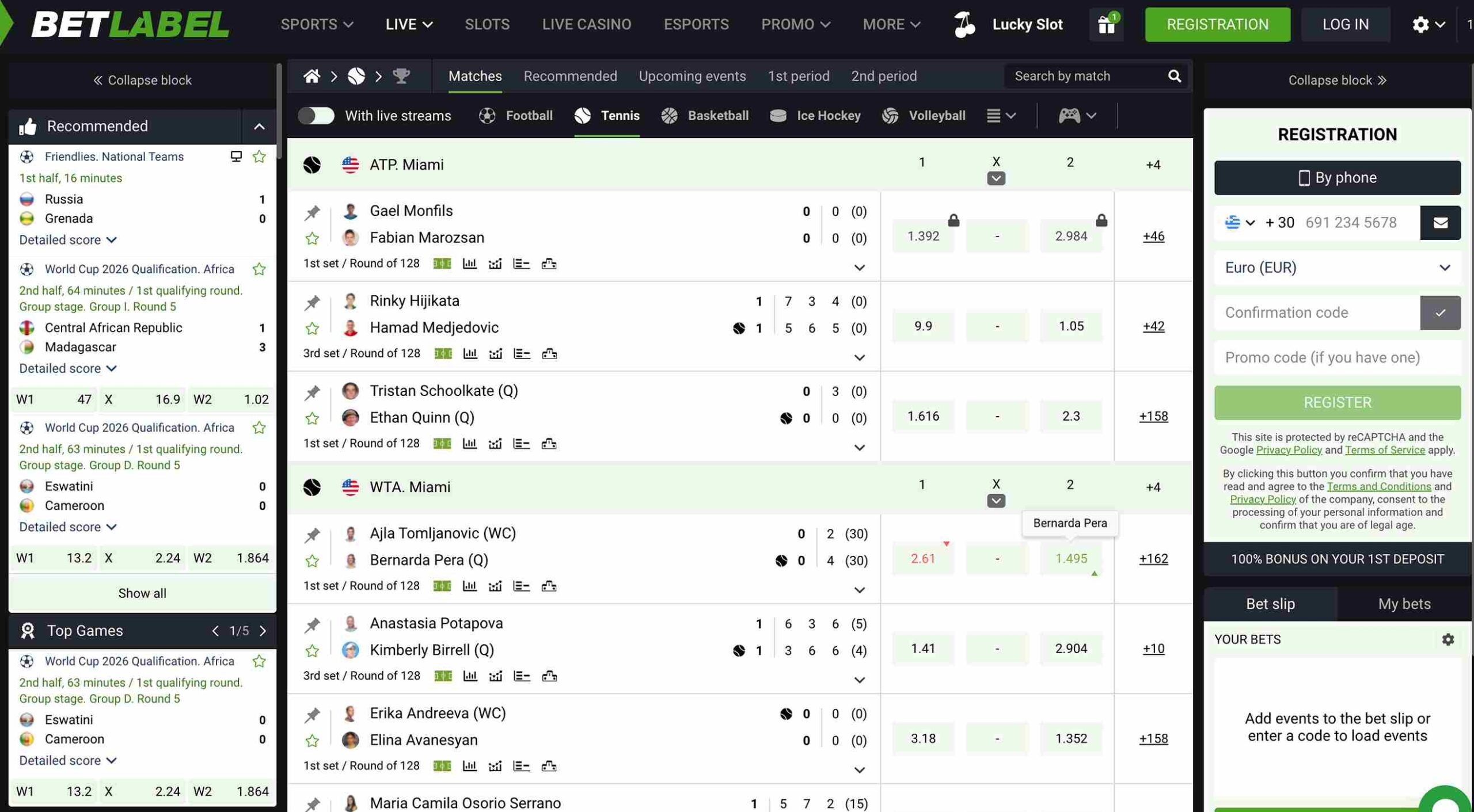 Μεγάλη ποικιλία αγορών (200+ στα μεγαλύτερα τουρνουά), καλές αποδόσεις, πολλά ειδικά, διαθέσιμα όλα τα τουρνουά (μεγάλα, μικρά) είναι το μενού τένις της BetLabel.