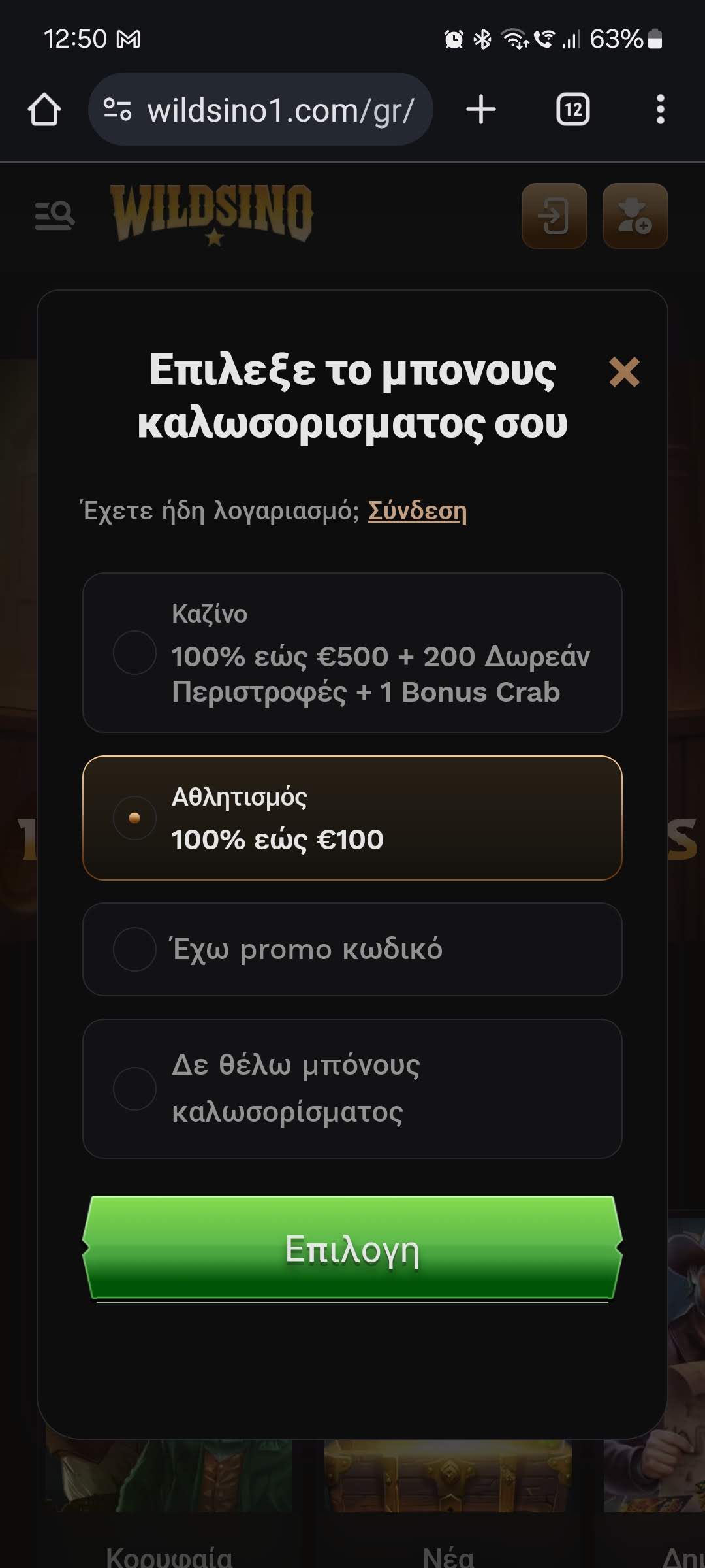 Το μπόνους καλωσορίσματος κινείται στα επίπεδα της αγοράς. Η εγγραφή στην Wildsino προσφέρει μπόνους 100% έως 100 ευρώ. Το δικαιούνται όλοι οι νέοι χρήστες της ιστοσελίδας, με την απαραίτητη προϋπόθεση να πληρούν τις παρακάτω προϋποθέσεις: